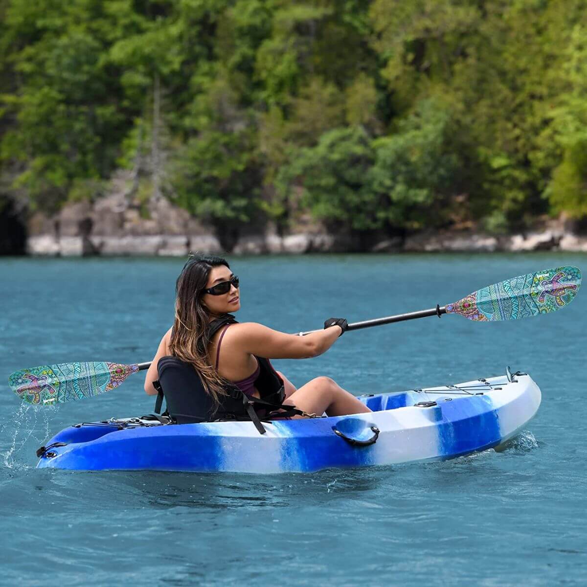 If you want to paddle in style then this carbon fiber kayak paddle is the bees knees. It's got a beautiful turtle design on the blade that will make you the envy of your friends, the graphic won't come off no matter how much water you splash around, and the dihedral and rounded blade shape makes for efficient paddling. The carbon fiber reinforced fiberglass shaft is designed for maximum durability and strength so you'll be able to take this bad boy out for a leisurely ride or a hard workout - it's got an optimal flex that will make your experience great every time.
